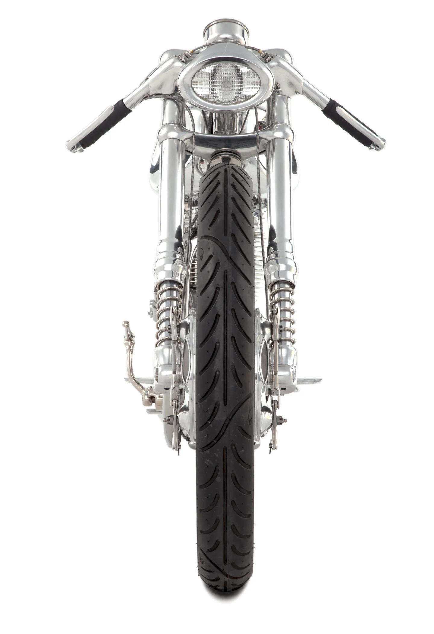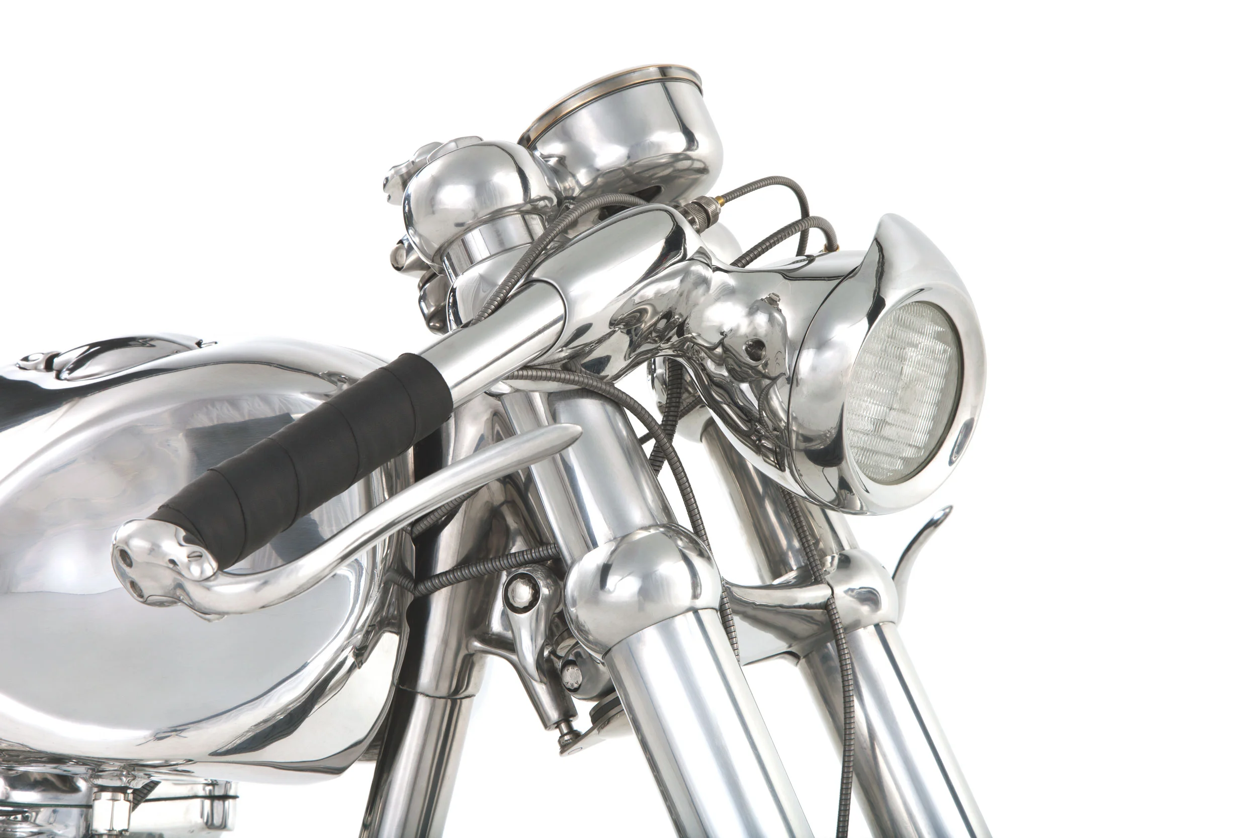 The inverted forks are wholly Ian Barry’s design, as is their integrated headlamp and handlebar unit, with its distinctive oval headlamp, carved from a single chunk of aluminum.
