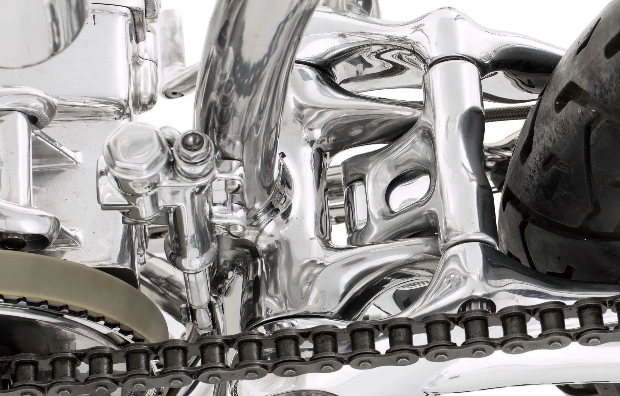 The shock is compressed by a pair of swingarms sculpted as musculature, with an attached bellcrank, which slides between a pair of frame outrigger arms; all parts move between and around each other, with softened edges and hand-hollowed forms.
