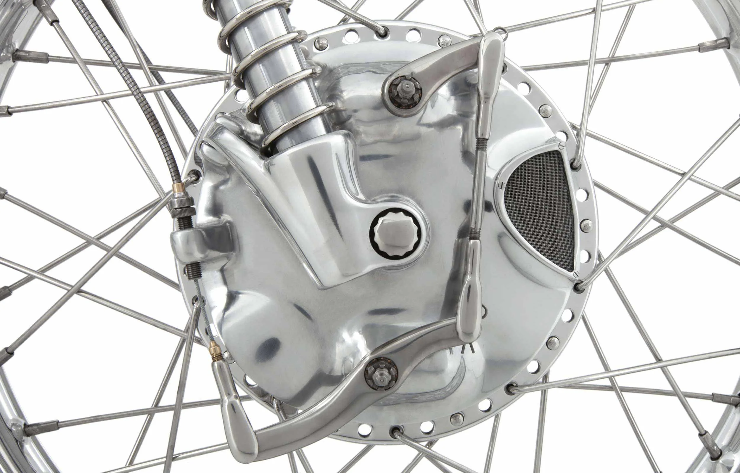 The White's details, typical of Falcon, include unique mirror-image four-leading shoe front brakes, based on the original Velocette design, but designed and engineered to be lighter, slimmer, and more exacting.